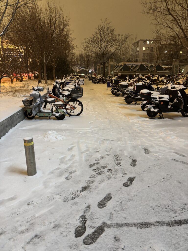 我还是第一次这样骑电动车,期间也是经历了轮胎打滑,最离谱的是整个电动车的车头都掉转了方向。下雪天气骑车必须小心小心再小心,尽量不要刹车,骑得慢一点。