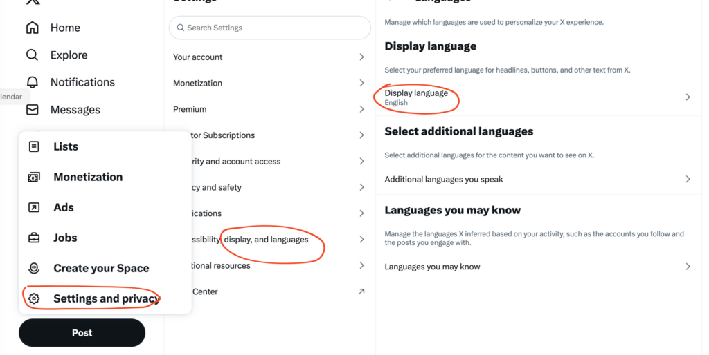 点击 More 然后点击 Settings and privacy,找到 Accessibility, display and languages 然后点击languages,将语言设置成英文。
