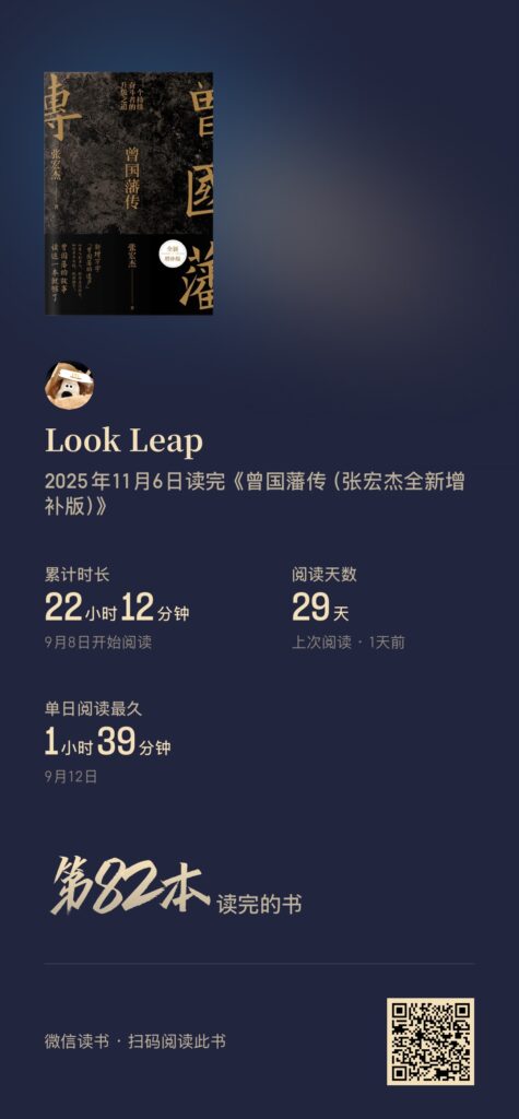 看了自己微信读书的书单,蛮多书都还没开始读,听书也没特意去选择什么主题,选的是历史,第一本就是《曾国藩传》,没错就是听完的,这本书并不是看完的。但总结下来自己可能就记得听到的几句话,其他的基本上都忘记了。